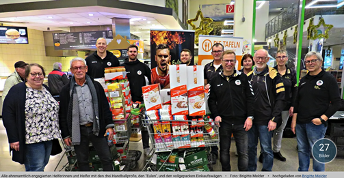 Ludwigshafen. „Einkaufen für den guten Zweck“, das war die Prämisse für den Ludwigshafener Handballverein „Die Eulen“. Die Eulen-Profis Alexander Falk, bekannt als der „Falke“, der Hüne Lars Röller und der Saarländer Kian Schwarzer hatten sich für den Nachmittag des 9. Dezember ordentlich etwas vorgenommen. Sie zogen mit jeweils einem Einkaufswagen durch das Einkaufszentrum „Globus“ in Ludwigshafen-Oggersheim und luden so viel hinein wie es ging, sodass die angestrebte Gesamthöhe von 2,04 Meter, gemessen an Lars Röller, erreicht wurde und dann zwecks Umfallschutz auf die anderen beiden Wägen verteilt. Die Bezahlung des Einkaufs übernahm der Eulen-Club 100.